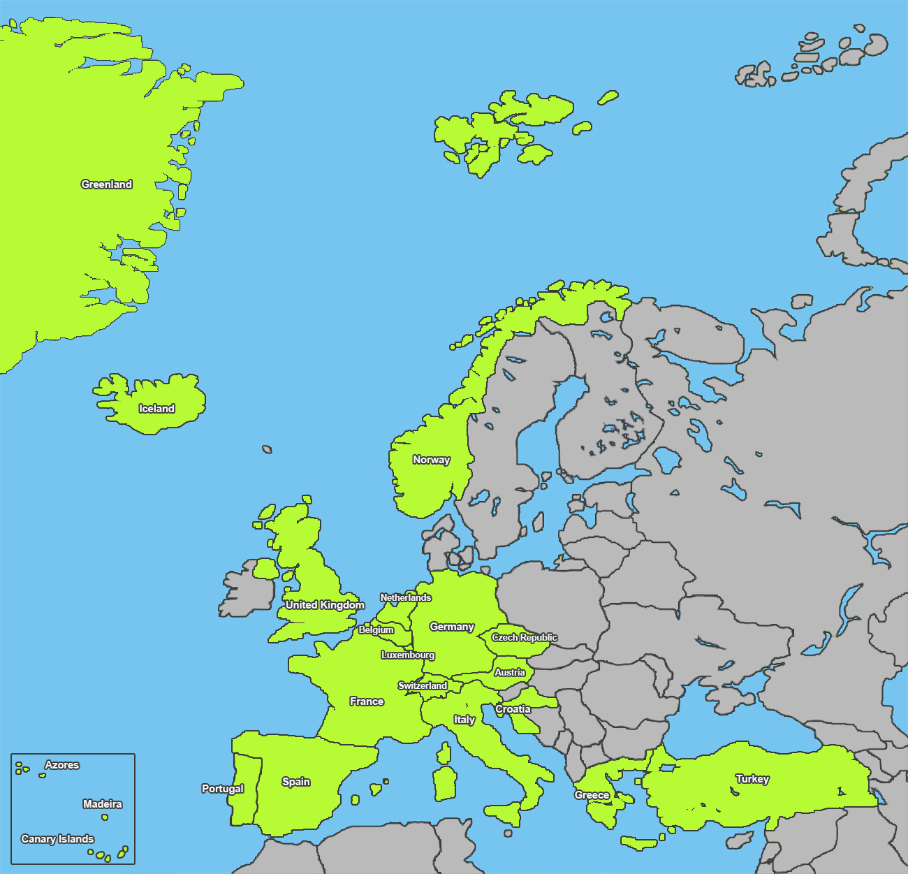 Austria Czech Republic Luxembourg Germany Netherlands Belgium Spain Greenland United Kingdom Turkey Switzerland Spain Portugal Portugal Norway Norway Italy Iceland France Greece Croatia